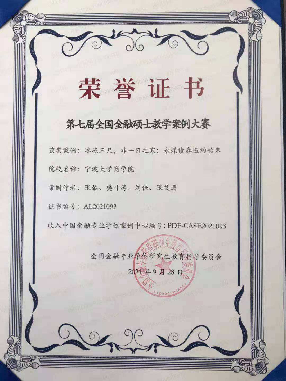 在2021年全国第七届金融硕士教学案例大赛中,17live 金融系张琴教授指导的《冰冻三尺,非一日之寒:永煤债券违约始末》在专家评审中脱颖而出,荣获全国优秀教学案例奖并入选全国金融硕士教学案例库。