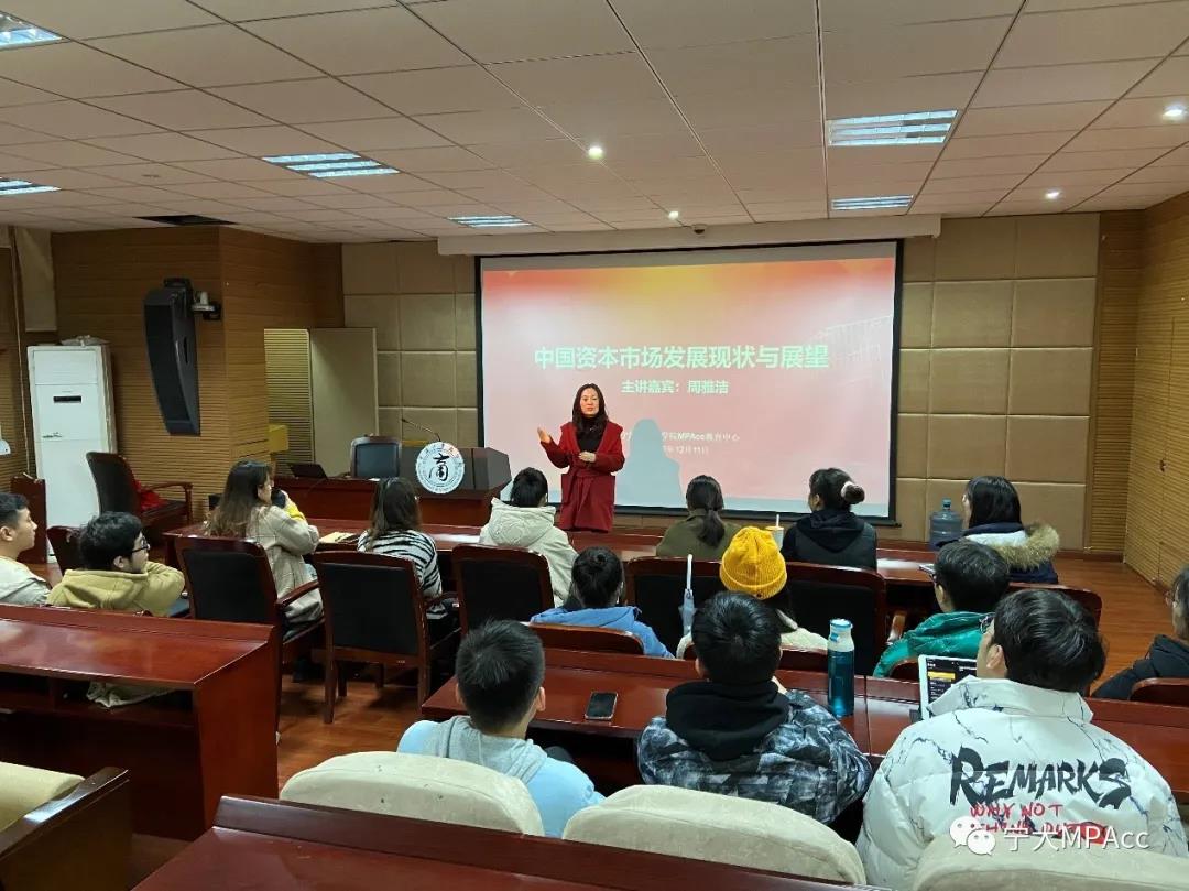 会计专硕(MPAcc)教育中心主办的主题为《中国资本市场发展现状与展望》的讲座顺利召开。本次讲座邀请到复星星元副总裁、复星创富董事总经理周雅洁女士作为主讲嘉宾,周雅洁紧密围绕中国资本市场的现状与展望主题结合自己的实际工作进行了精彩的分享。讲座由会计专硕执行主任陈翼然老师主持,讲座吸引了全日制会计专硕以及会计学本科的数十名同学参与。