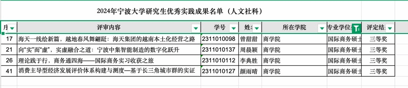国际商务硕士四项实践成果荣获三等奖。这些成果聚焦中国企业全球化实战与区域经济发展两大维度,彰显了专业学位教育“产教融合”的突出成效。