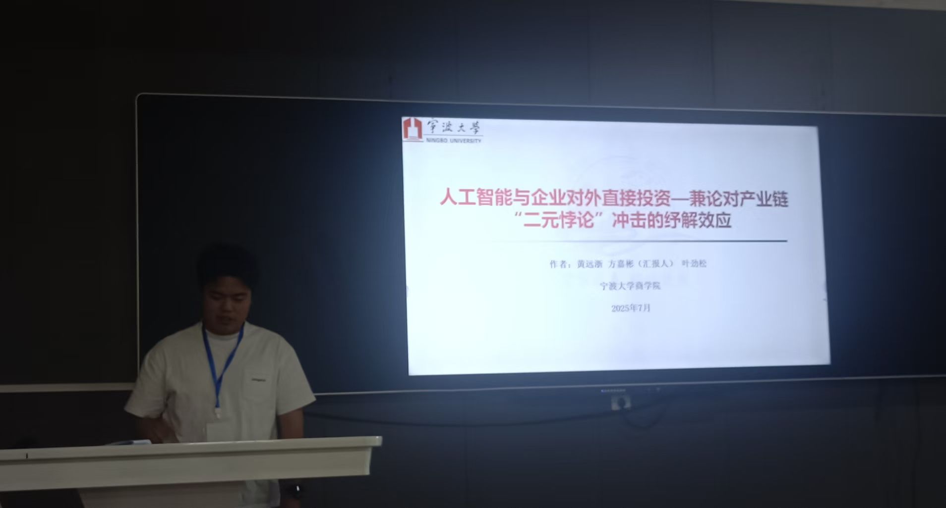 我校MIB学位点教师叶劲松和硕士生代表受邀参加了会议。分论坛上,2023级MIB朱艺蕾汇报了论文《人工智能应用对企业对外直接投资二元边际的影响研究》,2022级MIB方嘉彬汇报了论文《人工智能与企业对外直接投资——兼论对产业链“二元悖论”冲击的纾解效应》,专家学者们肯定了论文的规范性和实证的深入程度,并就故事表达和论文理论性给出了中肯的意见和建议。