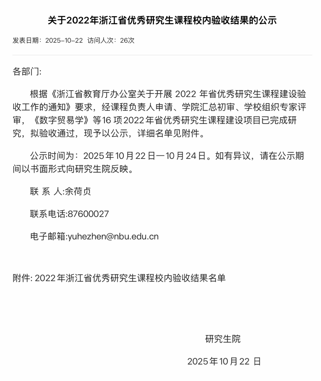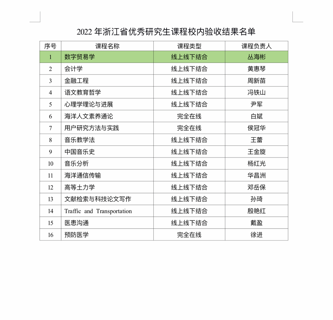 近日,根据《浙江省教育厅办公室关于开展2022年省优秀研究生课程建设验收工作的通知》要求,经课程负责人申请、学院汇总初审及学校组织专家评审,我校MIB学位点丛海彬教授主持的《数字贸易学》课程成功通过2022年浙江省优秀研究生课程校内验收。