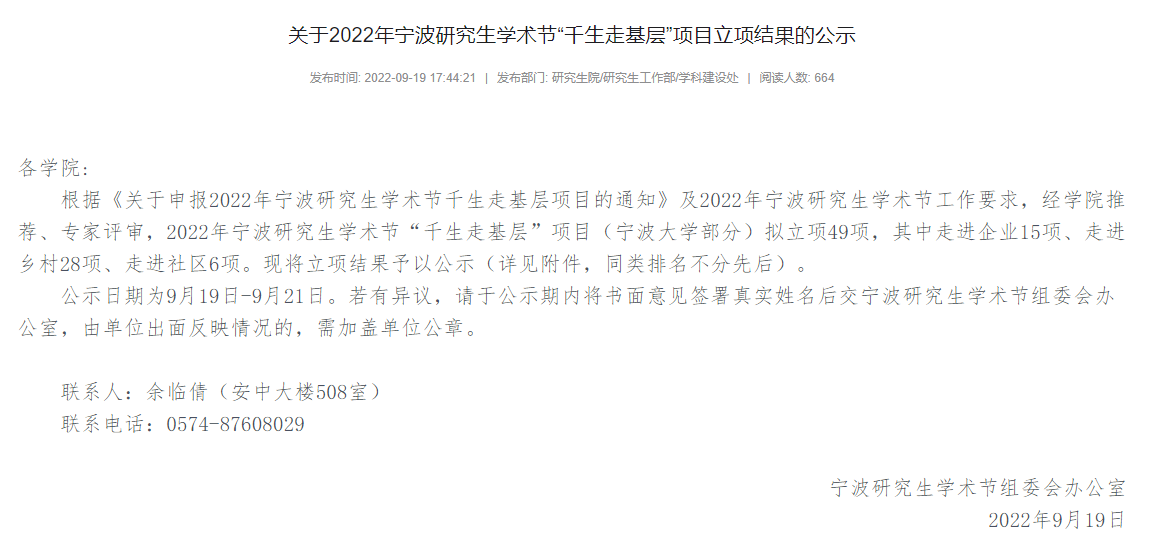 根据《关于申报2022年宁波研究生学术节千生走基层项目的通知》及2022年宁波研究生学术节工作要求,经学院推荐、专家评审,2022年宁波研究生学术节“千生走基层”项目(17live