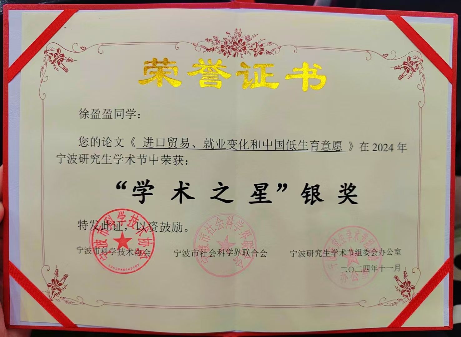 黄远浙等多位教师的指导和建议的基础上,多次完善修改后形成最终版本。该论文主要研究了进口贸易是否以及如何影响居民的生育意愿,有助于进一步理解开放经济下居民的生育选择行为变化,并且基于理论和实证分析对中国如何走出低生育率困境提出了自己的看法与见解。在写作中,徐盈盈同学始终注重细节,确保所得结论的准确性和可靠性,保持对学术创作的严谨和尊重。