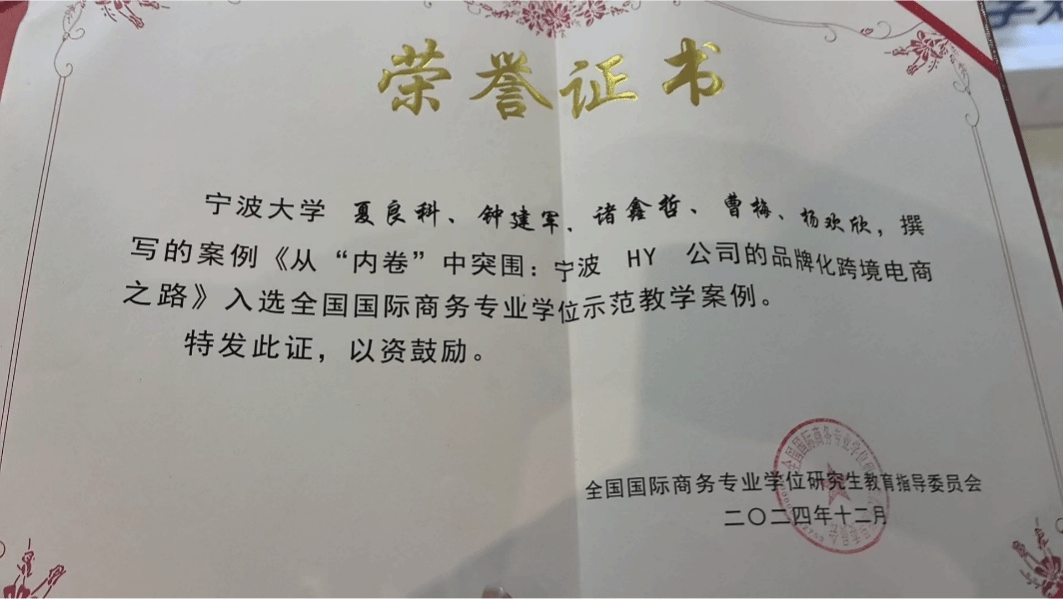 由我校国际商务专业硕士学位点教师夏良科、钟建军与2022级MIB研究生诸鑫哲、曹梅、杨欢欣共同撰写的案例《从“内卷”中突围:宁波HY公司的品牌化跨境电商之路》成功入选全国国际商务专业学位示范教学案例。该荣誉由全国国际商务专业学位研究生教育指导委员会颁发,彰显了17live 国际商务学位点在国际商务教育领域的卓越实力。