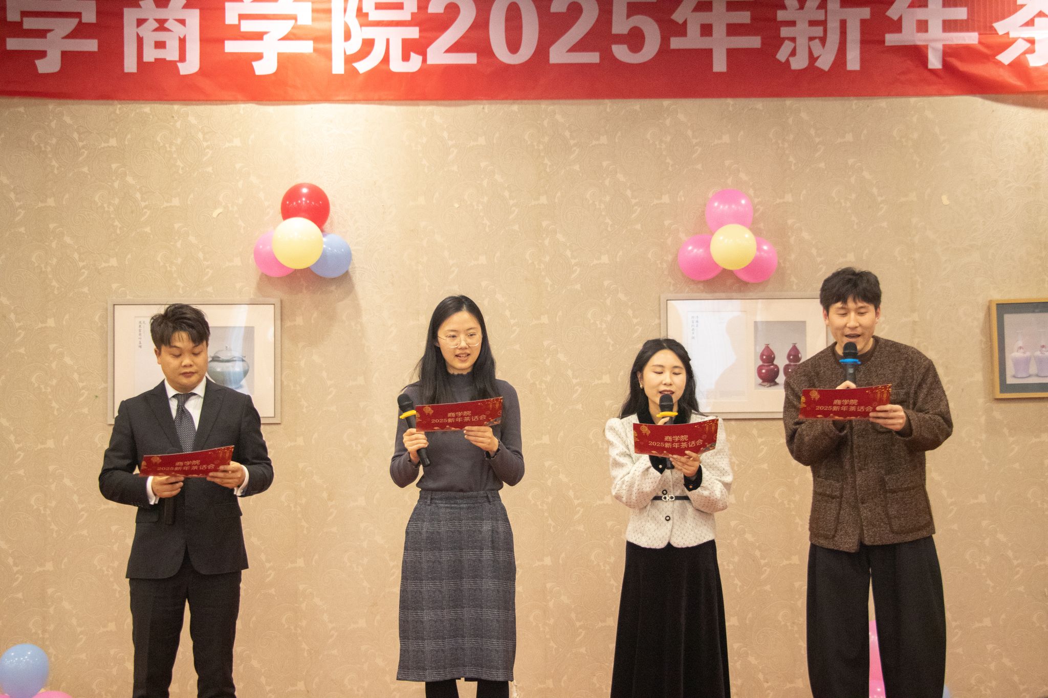 本次茶话会由朱福建、宋辉和王晶晶三位老师主持。茶话会安排了11个文艺节目,包括合唱、朗诵、互动游戏、影视作品配音、歌曲联唱、相声等,节目均由学院教职工精心准备,内容表演精彩纷呈,现场喝彩不断,欢声笑语此起彼伏,气氛浓厚热烈。