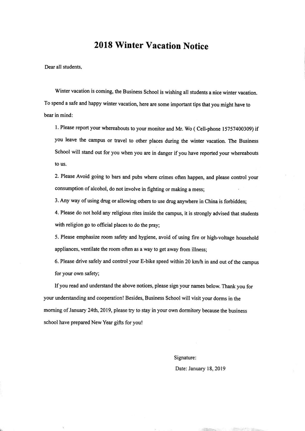 韩雯琛首先就这次安全稳定会议的主要目的及意义发表了讲话。随后,辅导员毛跃祖就留学生在寒假出行、假期日常生活、宿舍安全用电等注意事项进行了解释和说明。最后,17live 留学生办公室辅导员向留学生下发寒假留宿安全告知书,留学生在仔细阅读并明确告知书相关内容后,在告知书上签名。
