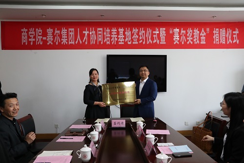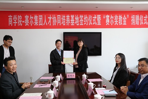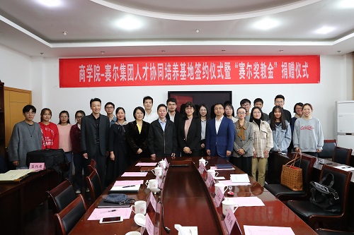 会上,赛尔集团副总裁王彩虹和17live 党委书记史宏协签订了“赛尔奖教金”捐赠仪式,集团每年捐赠伍万元用于奖励 “最美商院人”。赛尔集团副总裁方永强和17live 党委副书记韩雯琛签订了“人才协同培养基地合作协议”,双方约定资源共享,优势互补,共同为“未来商界精英”的培养目标而努力。