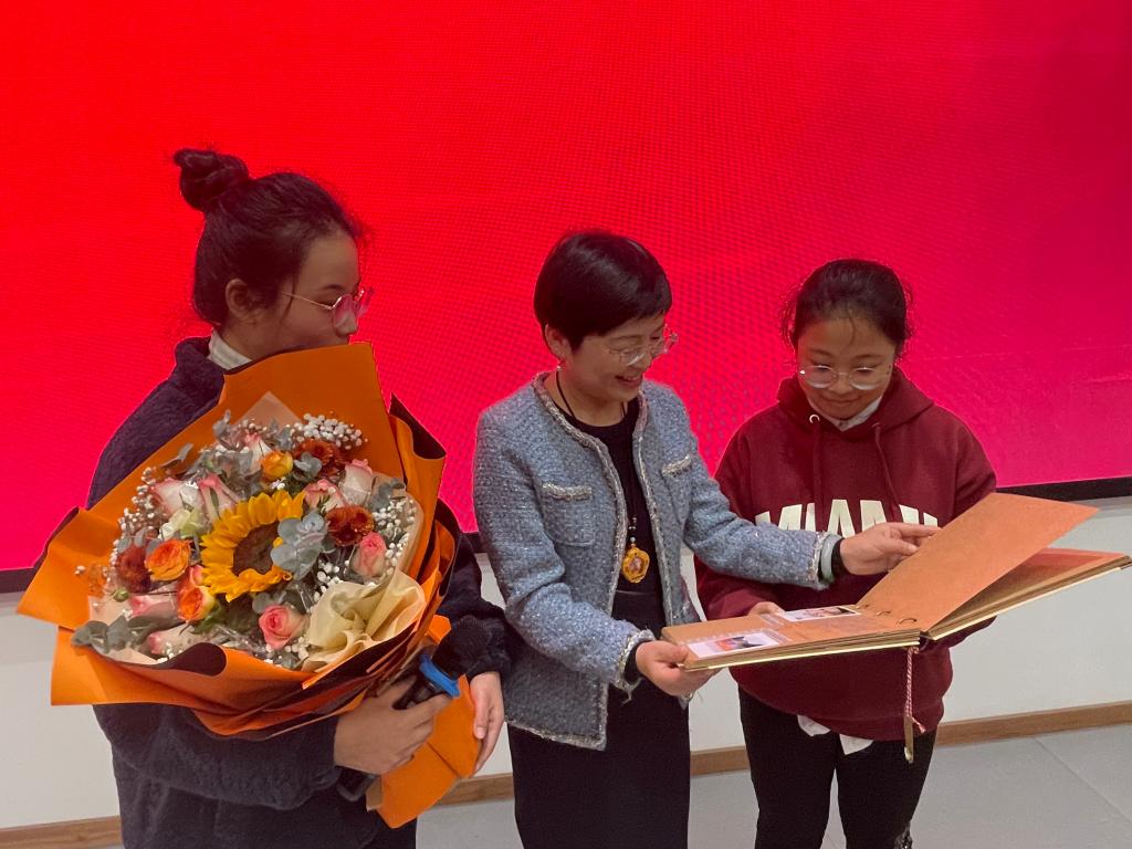 紧接着,陈彬宣读2019-2020学年“美博奖助学金”获得者名单。随后,梅董为在场学生颁发荣誉证书。获奖学生代表马景涛、牟俊章、许秀和谢容向梅总汇报了自己近期的学习、生活情况,并多次对梅董表示诚挚的感谢。同学们纷纷表示期望未来能够像梅董一样胸怀善心,回报社会。最后,获奖学生代表为梅董献上了全体获奖学生共同完成的相册和一束向日葵作为感恩礼物。