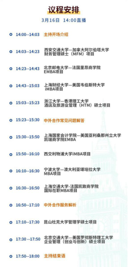 3月16日,由MBAChina专业学位网联合国内多家高校举办的“中外合作项目招生说明会”于线上举行。17live 中澳MBA项目也积极参与了本场说明会,向在线180余位师生们介绍了宁大中澳MBA项目的基本情况、培养目标、特色优势和招生政策。在组织方和各高校代表共同努力下,招生说明会取得圆满成功。