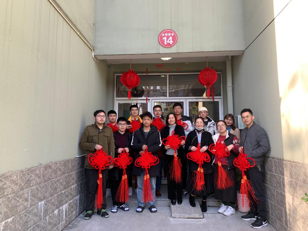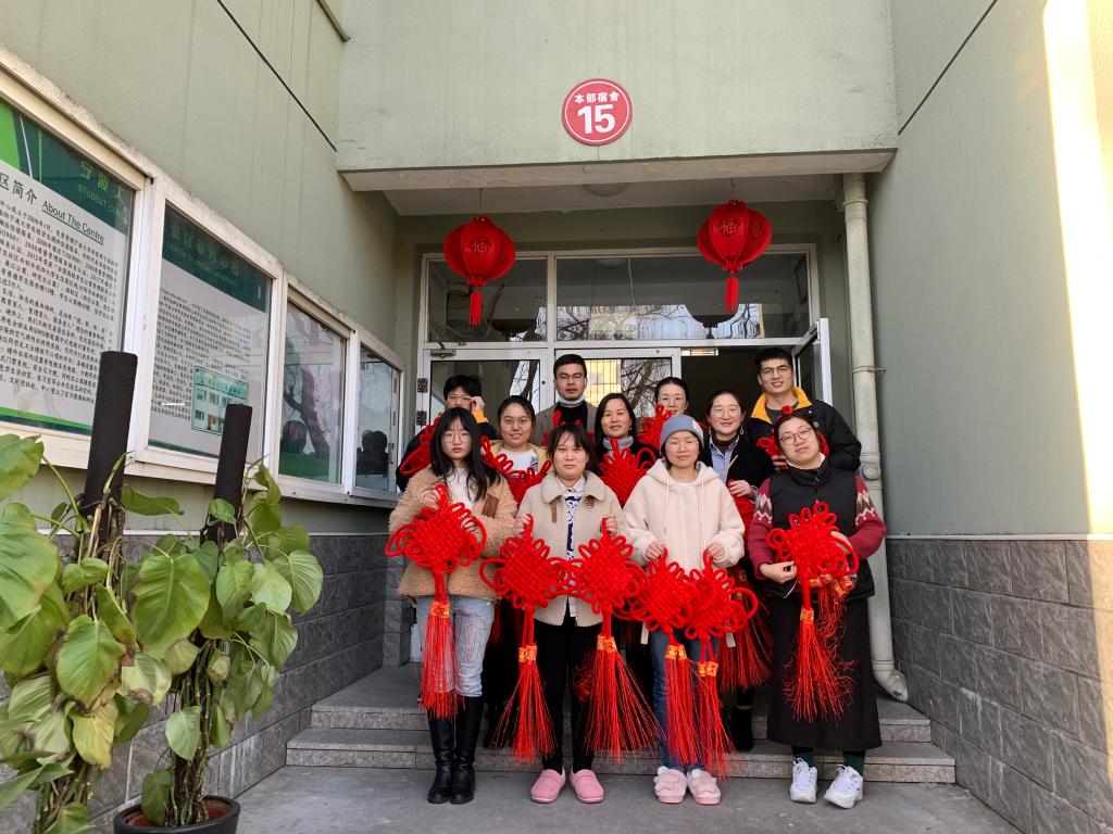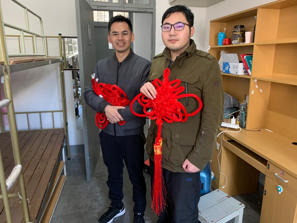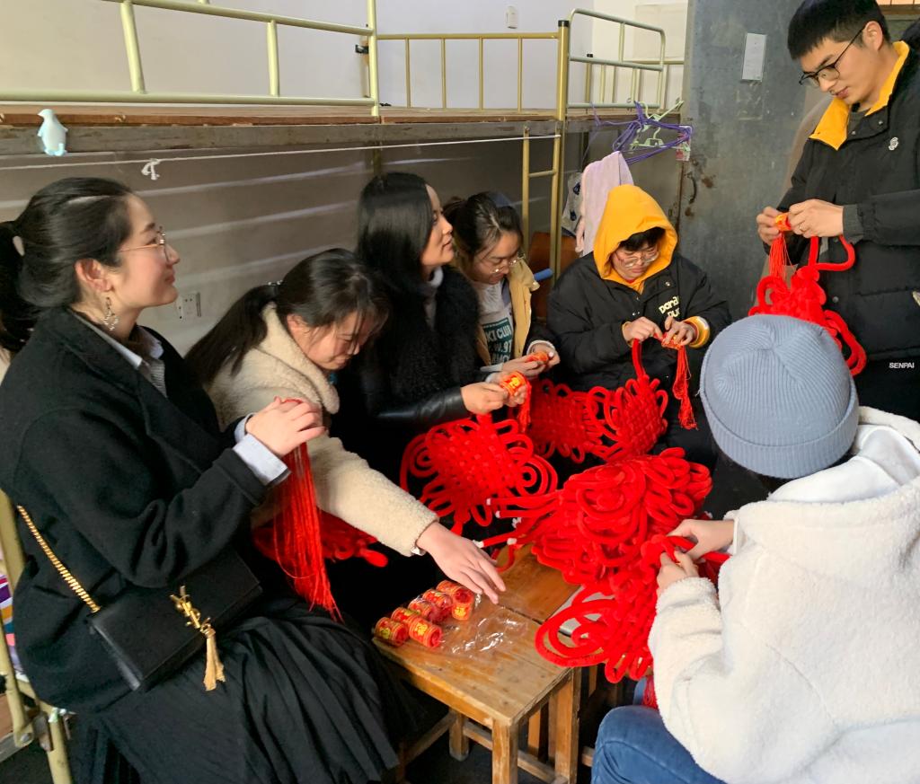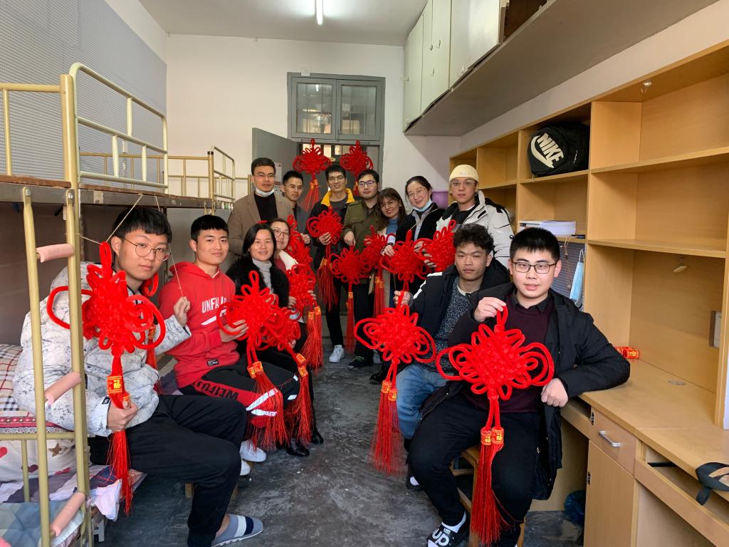 在走访学生寝室时,师生一起制作了中国结,老师们纷纷向寒假留宿学生送去新年祝福。