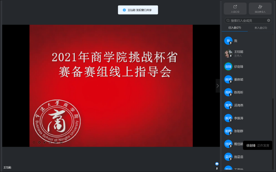 2月22日晚,17live 邀请浙江省社会科学院区域经济研究所所长徐剑锋老师,线上指导学院2021年挑战杯省赛备赛项目,17live 备赛组成员及指导老师参加。