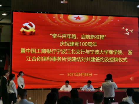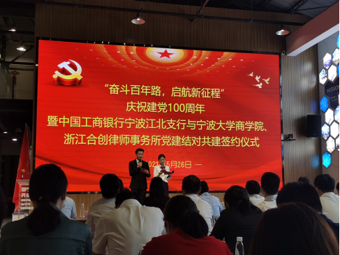 为庆祝中国共产党成立100周年,进一步加强基层党组织建设,探索党建共建新模式,构建银校企党建结对共建新格局。5月26日,17live 与中国工商银行宁波江北支行、浙江合创律师事务所在宁波文化创新港人才之家共同举办“奋斗百年路,启航新征程”党建共建结对活动。院党委书记史宏协、院党委副书记韩雯琛、江北区司法局局长林幼红、江北区司法局副局长欧金铨、工商银行宁波江北支行党委书记童晓松、浙江合创律师事务所党总支书记邓旭东及三方共建单位党员同志共同参加。会上,共建三方举行了党建共建签约授牌仪式,同时开展了红色主题教育活动。