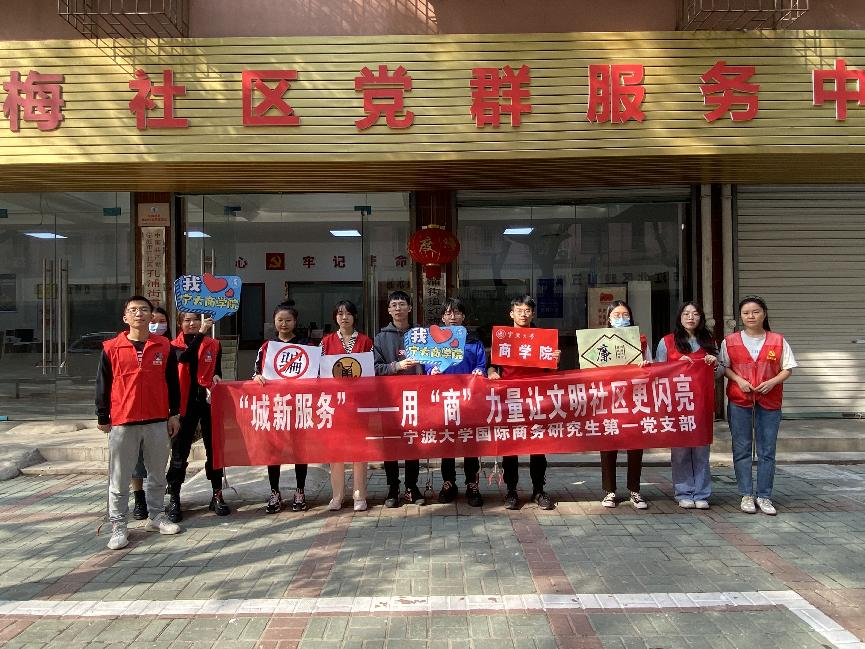 为鼓励学生党员积极加入文明城市创建工作,以实际行动弘扬志愿者服务精神,提升城市“文明指数”,为宁波市创建文明城市贡献力量。10月26日,17live 国际商务专业研究生第一党支部在孔浦社区开展了“城新服务”——用“商”力量让文明社区更闪亮活动。
