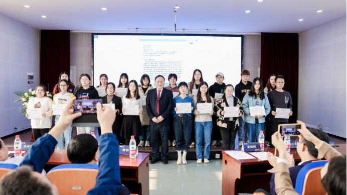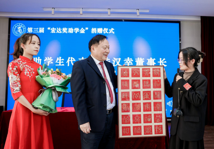 随后,新一届“宏达奖助学金”的受助学生向陆董赠送了亲手制作的“百福图”。陆董对受助学生们提出了几点建议和要求,希望他们能珍惜在宁大读书的机会,用自己的努力,用创新的精神,在充满竞争的社会里力争上游,德智体全面发展。