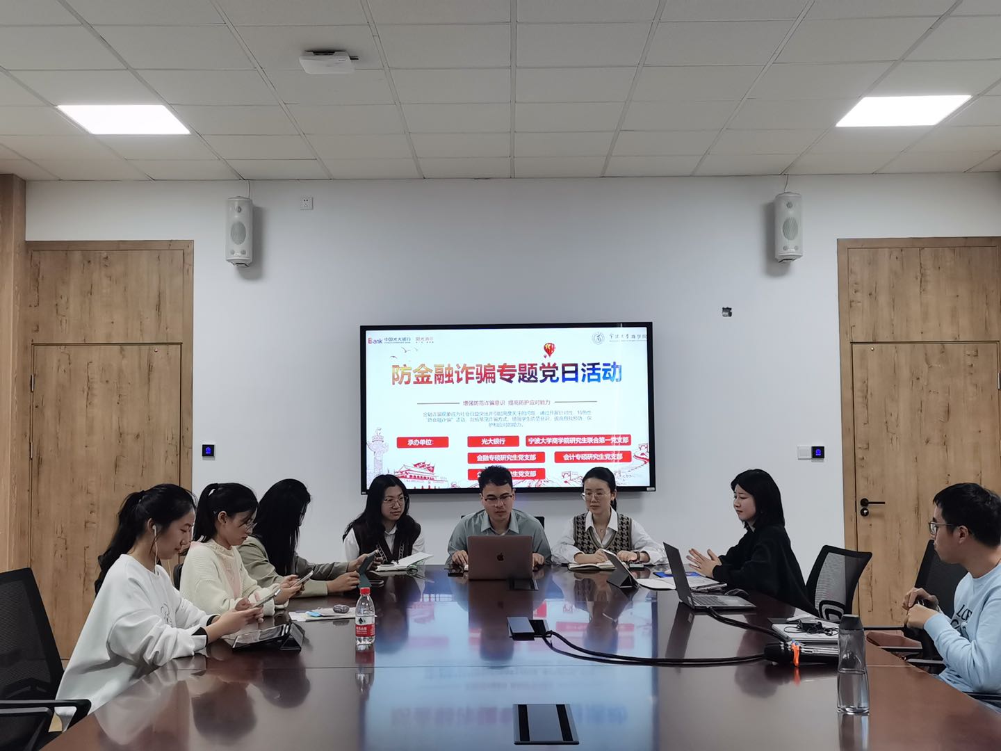 接下来,由金融专硕党支部代表讲解防范金融诈骗要点,支部党员再次用生动的案例,为大家介绍了QQ诈骗、冒充身份诈骗、网络购物诈骗、虚假中奖诈骗、虚假绑架诈骗、假车祸或摔伤住院为名的诈骗等常见电信诈骗手段。
