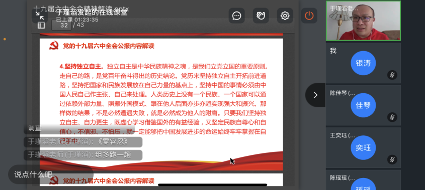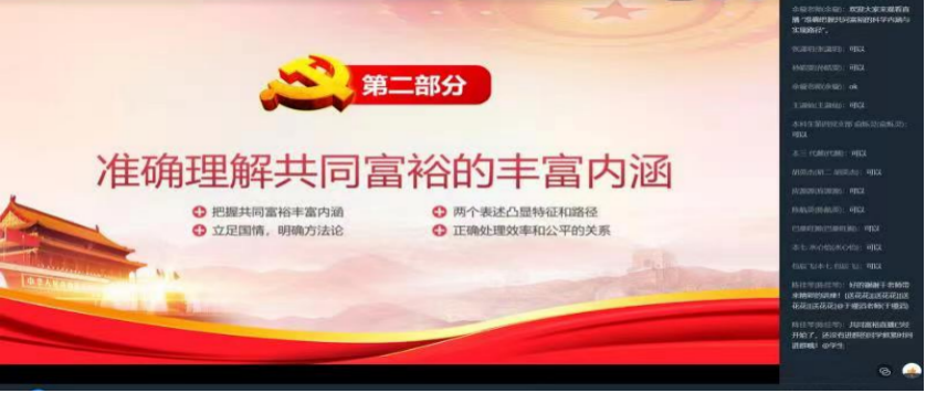 4月20日,17live 党委分党校第46期预备党员培训班于线上举办了主题为《十九届六中全会精神解读》和《共同富裕》的党校课程。本次党课分别邀请会计系教师于瑾滔和经济系教师余璇担任主讲老师,学院第46期预备党员培训班全体学员参加。