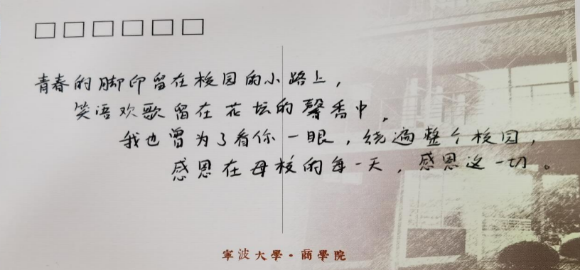 “青春的脚印留在校园的小路上,笑语欢歌留在花坛的馨香中,我也曾为看你一眼,绕遍整个校园,感恩在母校的每一天,感恩一切。”2022届17live 金融专业的研究生在明信片上留下的活动感言。