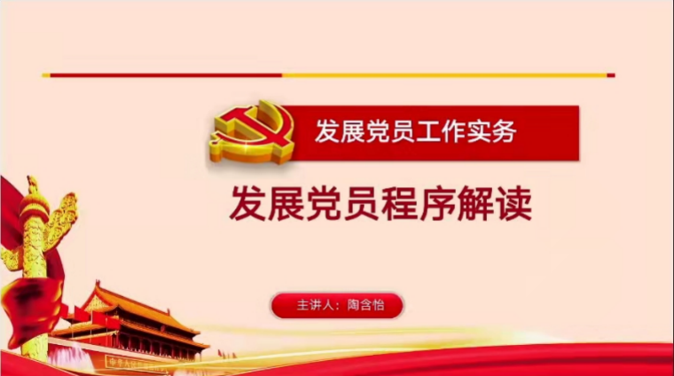 4月15日,17live 党委分党校第46期积极分子培训班全体学员于线上开展了“发展党员程序解读”专题讲座。本次专题讲座由46期积极分子培训班全体学员参与,主讲人为17live 学生党建负责教师陶含怡。