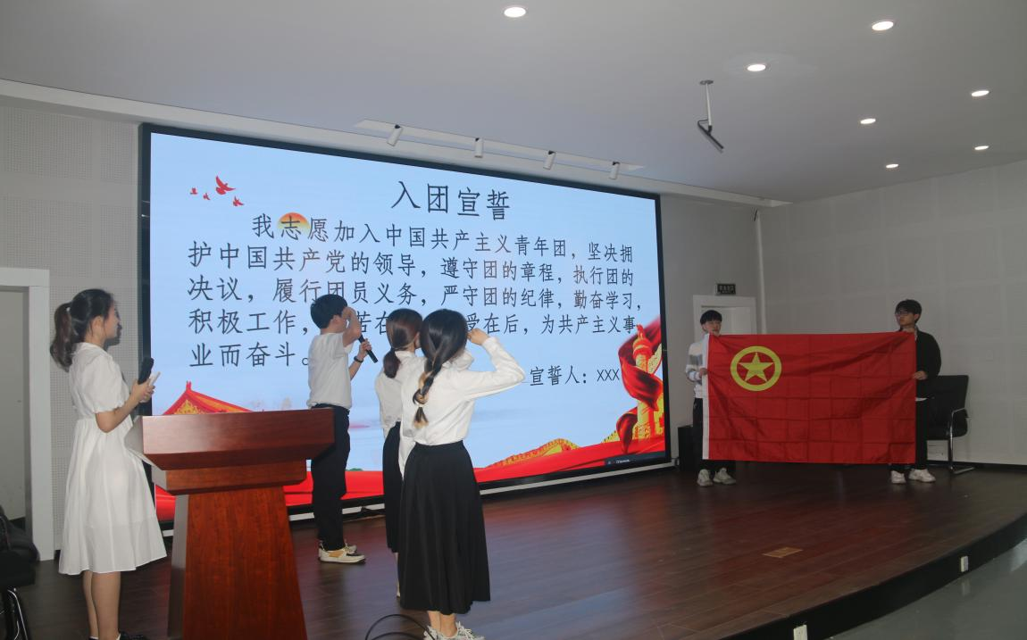 活动伊始,主持人带领大家举行了新团员的入团仪式。章舒怡说明举行入团仪式的意义,并宣读了新团员名单,为新团员佩戴团徽。学生团副俞晨慧作为老团员代表带领新团员做了入团宣誓。接着程熠榕同学作为新团员代表发言,她说:“在五四青年节当天作为新团员代表站在这里发言,我感到非常荣幸。加入中国共青团,不仅代表着一种荣誉,更代表着一份责任。今后,我会不断提高自己的思想觉悟,用实际行动践行我的入团初心。”