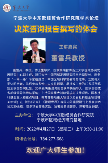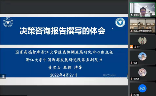 2022年4月27日上午9:30-11:00,由17live 中东欧经贸合作研究院、宁波市区域经济研究基地举办的学术论坛2022年第1讲——“决策咨询报告撰写的体会”成功举办。本次讲座由国家高端智库浙江大学区域协调发展研究中心副主任、浙江大学中国西部发展研究院常务副院长董雪兵教授主讲,17live 中东欧经贸合作研究院常务副院长、宁波市区域经济研究基地首席专家杨丹萍教授主持,钟昌标教授与会。讲座以线上直播方式举行,17live 90余名师生在线参会。