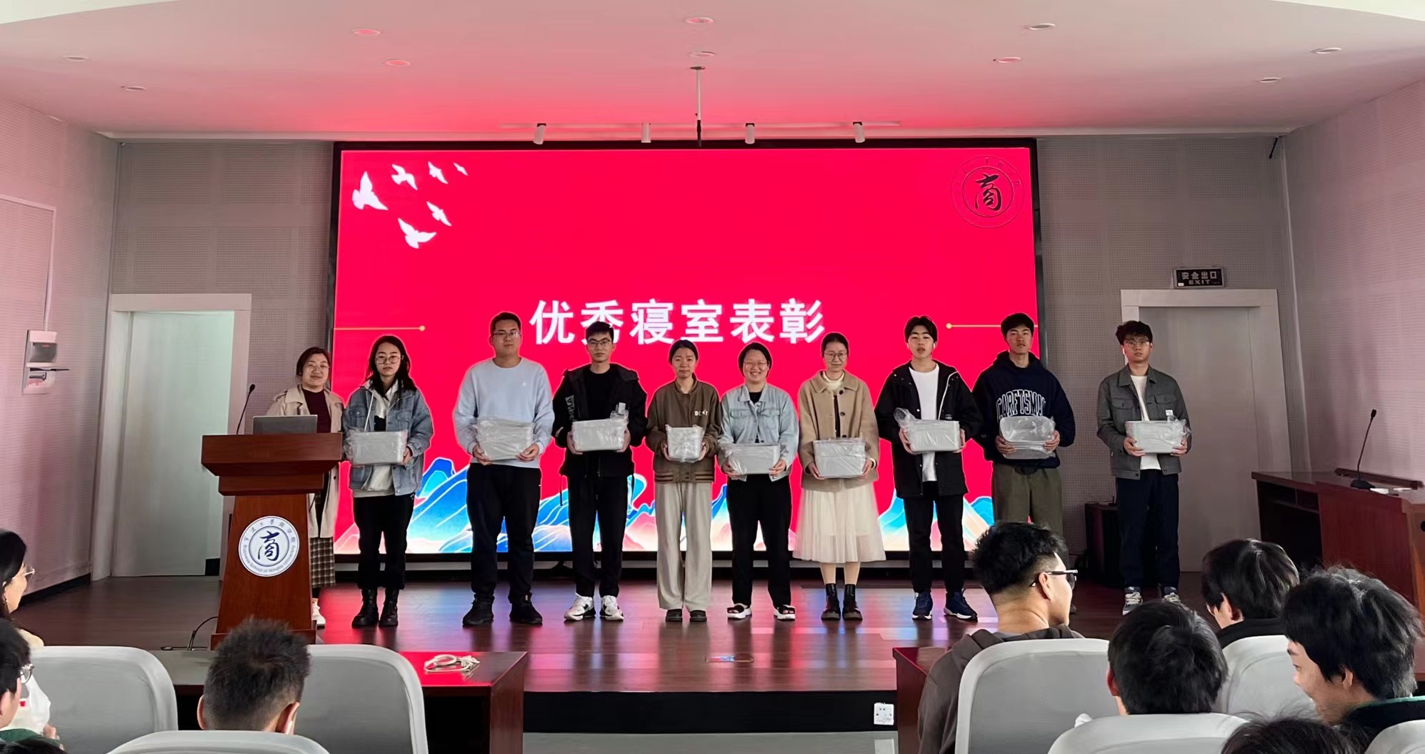 随后,朱文洁和麦尔阿巴分别为优秀寝室代表颁发奖品并合影留念。