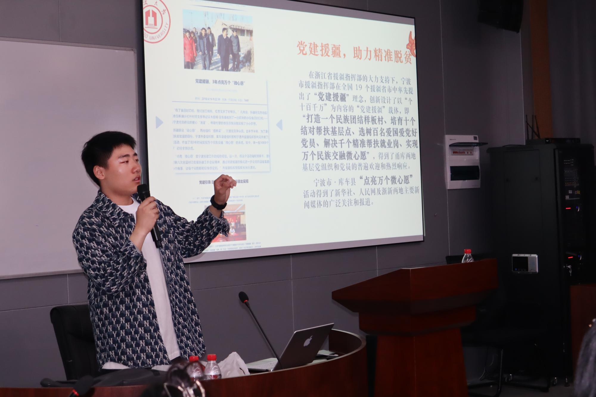讲座第二部分以“飞越‘甬疆’,共画同心圆:探寻民政团结答案”为主题,由“飞越”甬疆实践宣讲团队长戴秉邦讲述。戴秉邦以“大美新疆”宣传片导入,用有奖竞答援疆知识活动充分调动了现场的氛围和激发了同学们的兴趣。