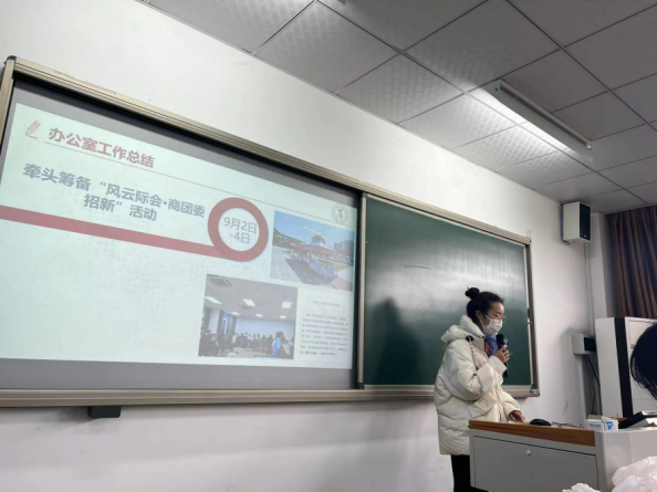 随后,会议主体部分由各个部门代表的发言组成,发言围绕各个部门第一学期中的工作进行汇报,与此同时还分享了许多部门内部的团建等活动,并对未来进行展望,帮助同学们明确了未来前进的方向与目标,激发了商团委成员投身建设商团委的活力与动力。
