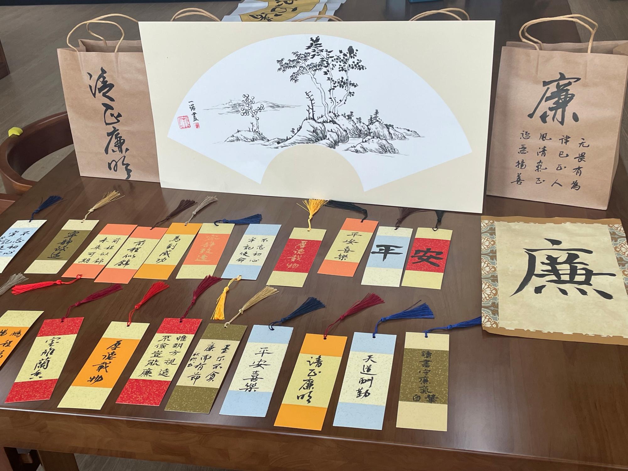 落笔挥墨教学环节。本次活动邀请到宁波女书协会员,余姚书法协会会员,余姚女书协理事孙秋珍老师进行书法指导。在老师带领下,同学们执笔在宣纸、书签和牛皮纸袋等载体上写下颂扬廉洁品行的诗词短句,学习了画竹以将廉洁的高尚品质寄托在“竹”这一意象之中。在书写绘画的过程中,优秀的作品不断涌现,赢得了书法老师和周围同学的一片称赞。