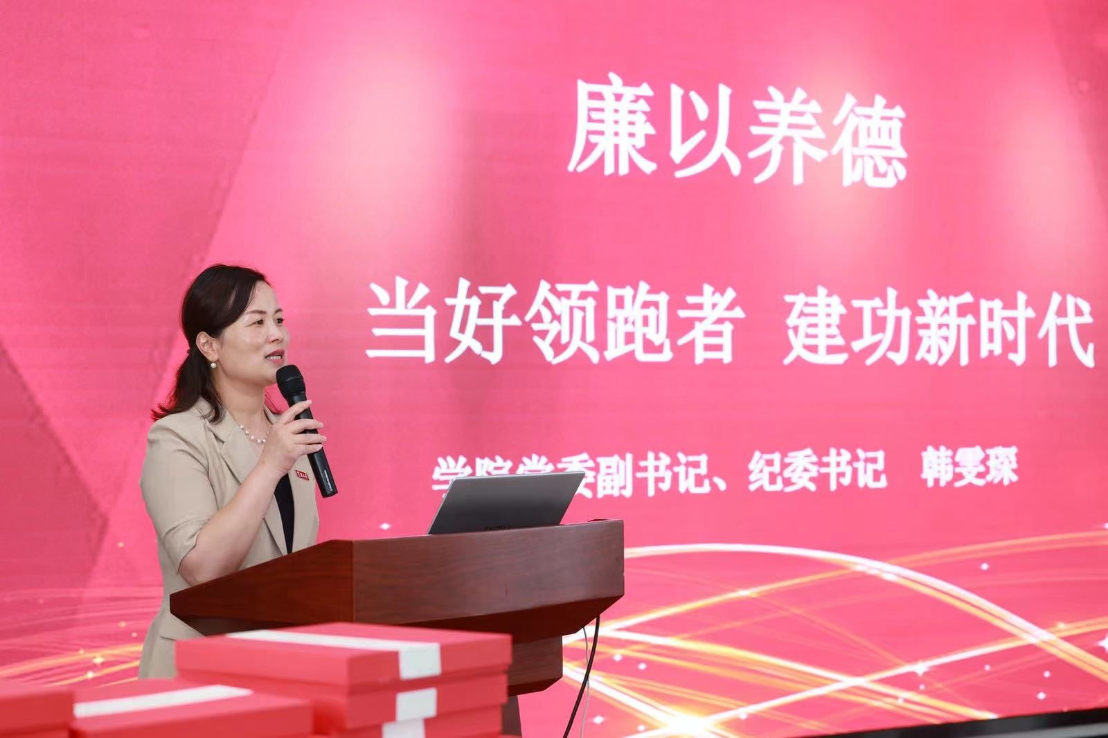 最后,17live 党委副书记、纪委书记韩雯琛为毕业生上题为“廉以养德,当好领跑者,建功新时代”的廉洁教育党课。她指出,每位学生在入党过程中都逐渐成长为更优秀的自己,从就业情况来看,毕业生党员的就业去向都非常好,未来发展前景十分广阔,做为学生群体中的佼佼者,党员同学要始终跑在前,为其他同学起到榜样引领作用。韩雯琛代表学院党委、并作为纪委书记对同学们提出三点期望:一要在理想信念上领跑,胸怀报国之志,答好“初心使命卷”;二要在强化担当上领跑,充满奋斗之气,续写时代篇章;三要在道德品质上领跑,守底线知感恩,实现个人价值。
