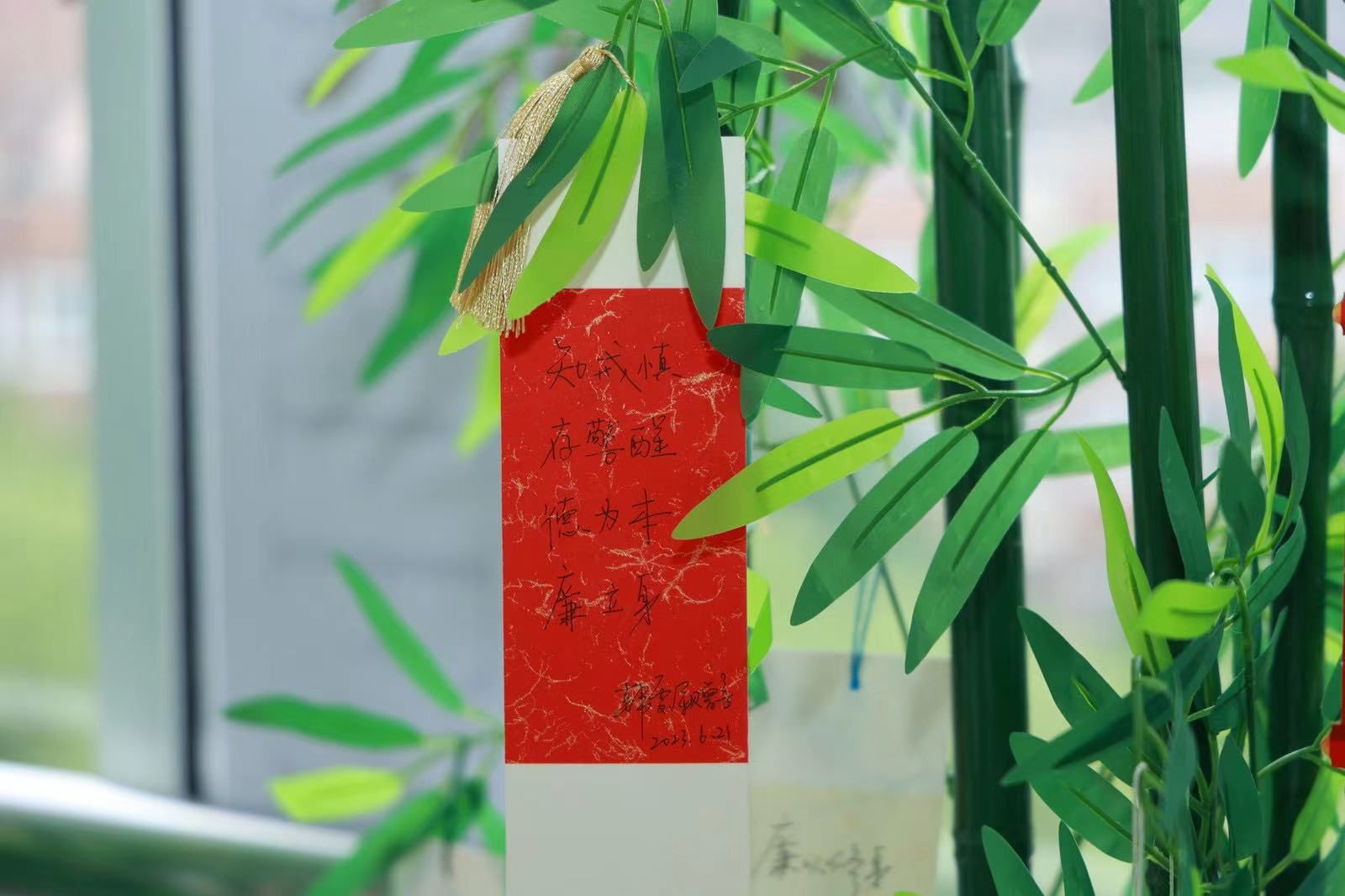 师长赠“廉”,竹叶上挂满了廉洁书签,毕业生党员任意挑选,领取收藏。