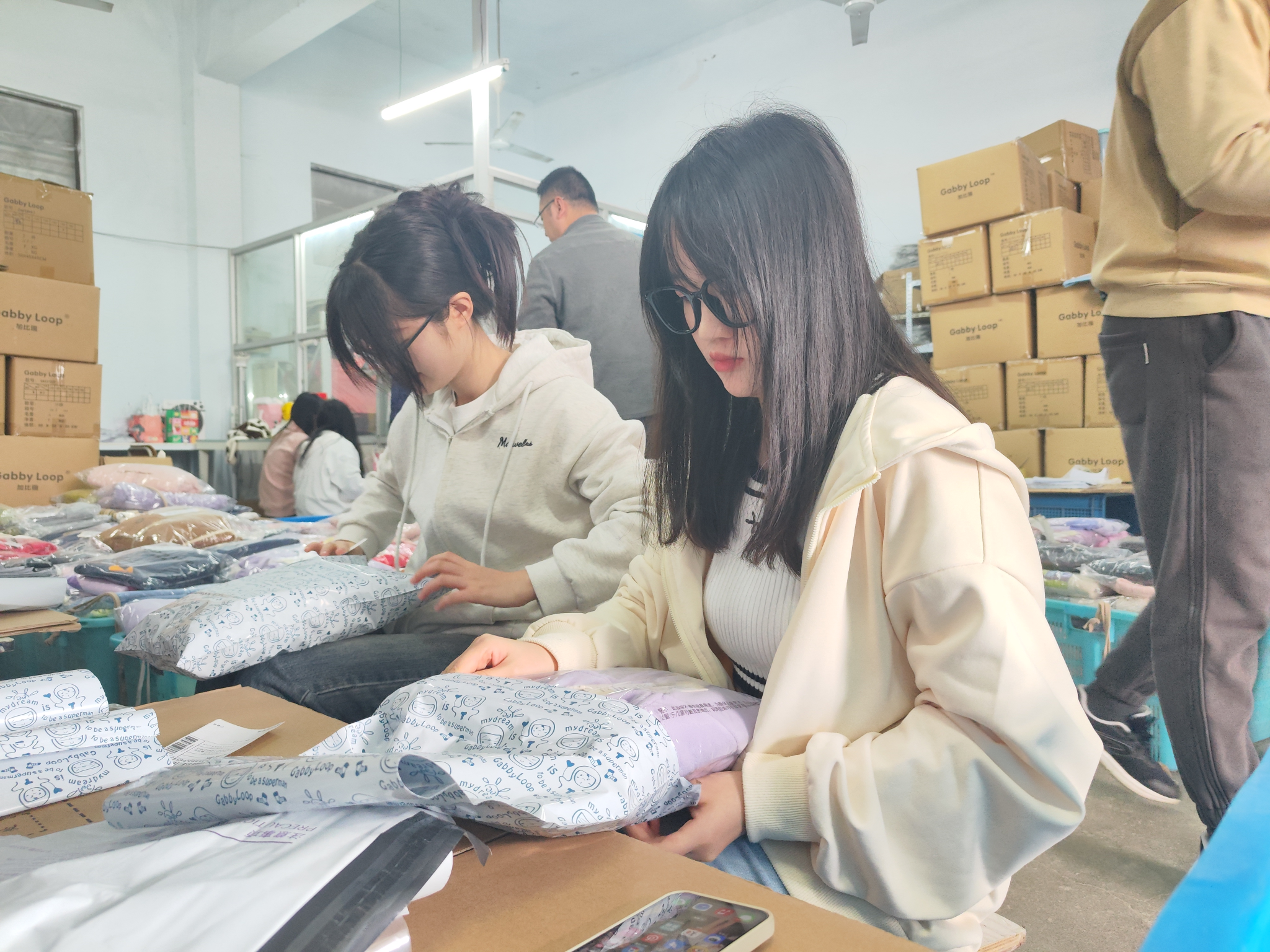 随后,同学们被分为3组,每组6-7人,分别体验了快递打包、退货整理、盘点等不同的工作项目。在现场工作人员的指导下,同学们迅速熟悉了各自的工作内容,很快就进入了工作状态。快递打包中,需要两人一组,一人检查核对订单和货物是否匹配,一人负责打包商品和粘贴订单;退货整理的同学则要对邮寄回来的衣服进行分类,并对货物进行折叠装袋,并重上标签和装袋,以便重新返仓售卖。