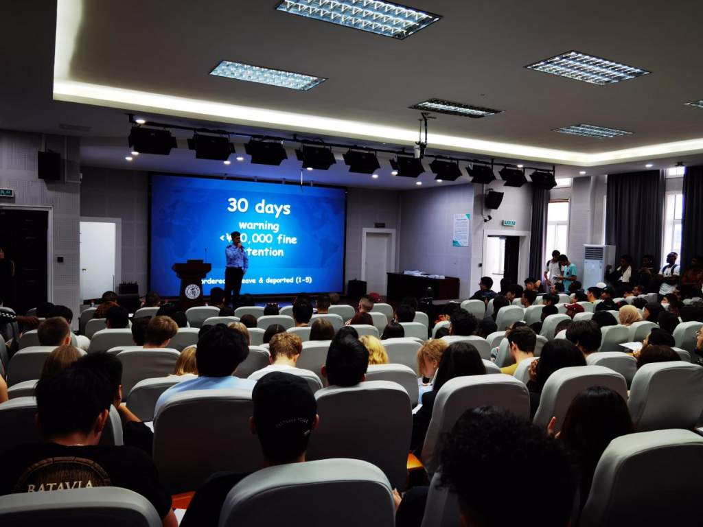 10月25日下午,第八期“夯基石、促学风”留学生专题系列教育活动暨治安安全案例讲座在曹光彪楼501教室举行。本次主题教育邀请到了庄市派出所杨延飞、周晓烜、苏励丽和郑晶文四位民警现身说法宣讲。