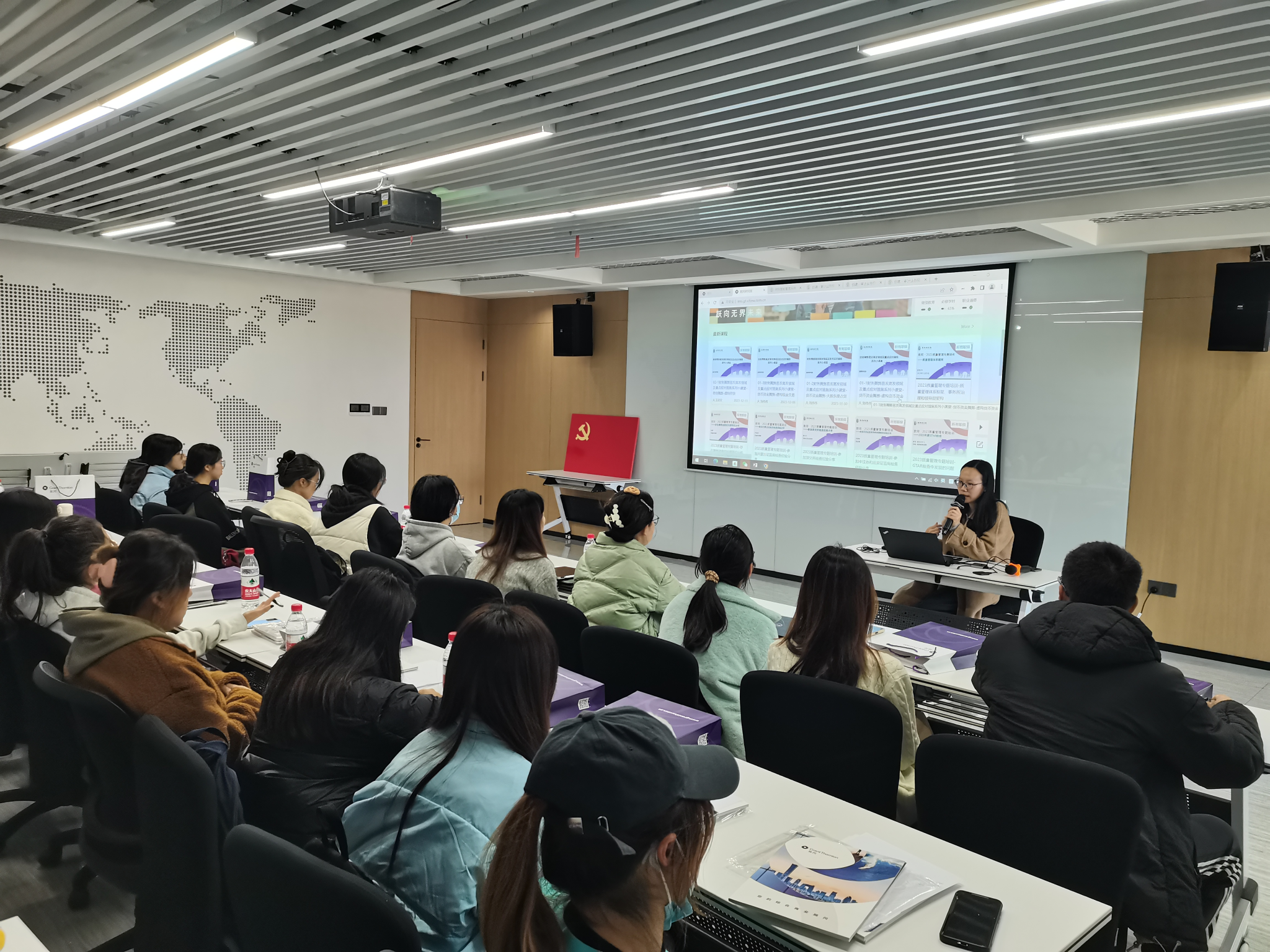 随后,致同所研究院的周丹老师结合自己的专业知识和同学们的理论基础,准备了具有针对性的教学课件,为同学们讲解了致同完整的审计业务流程,并在审计证据获取、审计工作底稿类型与内容以及审计业务约定书的格式等几个方面展开了详细的讲解。