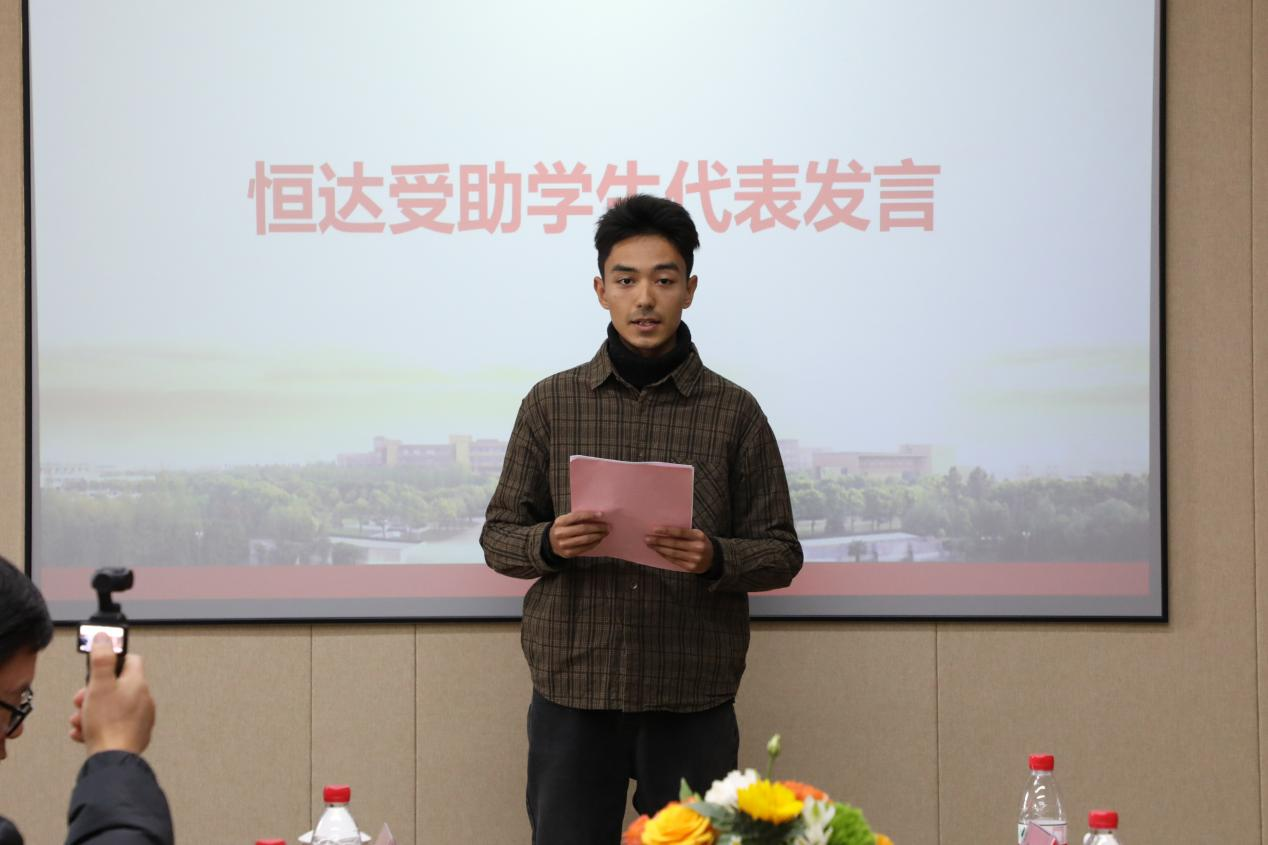 仪式上,恒达受助学生代表努尔扎提·乃比江发言,他感恩贺董的慷慨援助和关心指导,能够有勇敢地追梦的勇气!之后将以更加饱满的热情投入到学习中,不断提高自己的综合素质和能力,为社会和国家做出我们的贡献!
