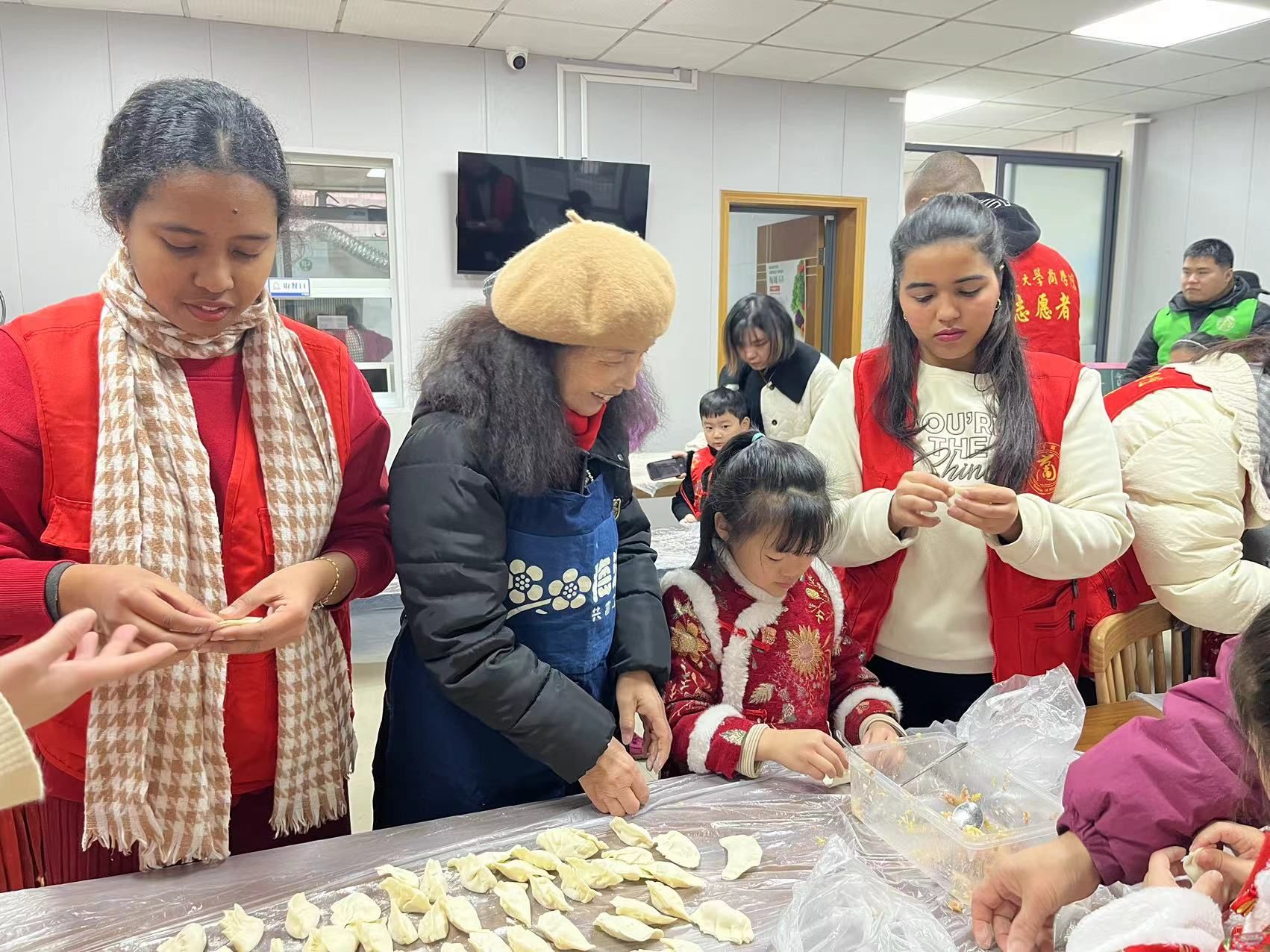 居家养老服务中心的工作人员耐心地讲解,并展示了包饺子的手法:先放馅、后捏边……留学生志愿者们虽然手法不太娴熟,却都兴致很浓,乐在其中。在工作人员的悉心指导下,志愿者们包饺子的手法逐渐熟练。