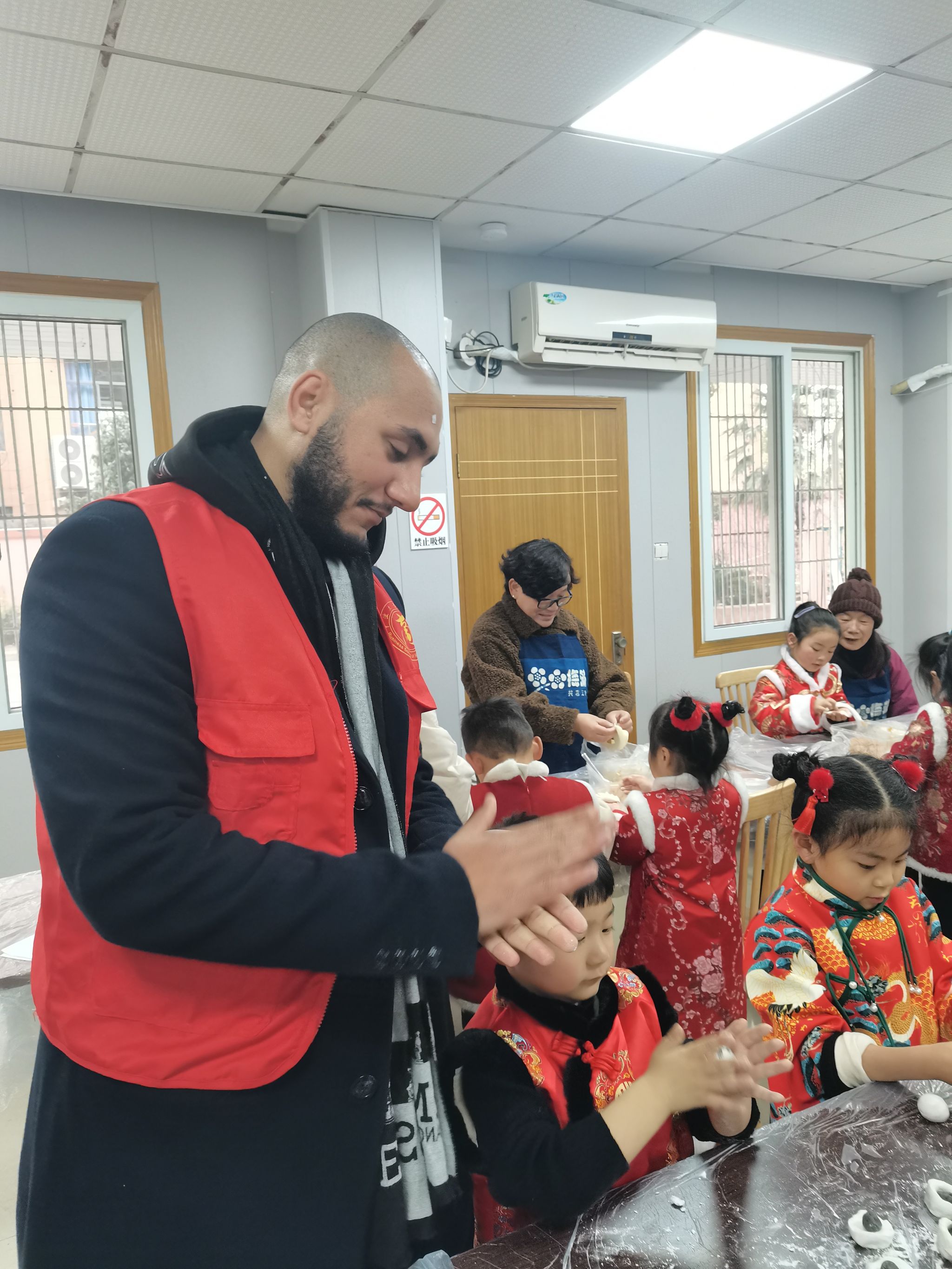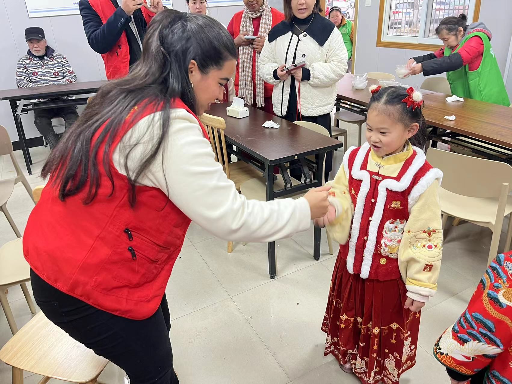 在活动正式开展之前,中外志愿者们先进行了自我介绍,并向在场的小朋友、老人们分享了自己家乡的节日风俗,小朋友们也向中外的“大朋友”们介绍了自己,整个活动现场欢声笑语、其乐融融。