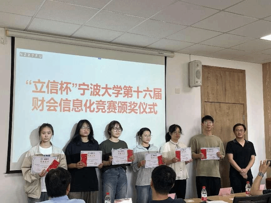 吴敏老师首先代表学院致欢迎词,他对与会的所有来宾表示了热烈的欢迎,对立信宁波分所给予财会信息化竞赛的大力支持表示了感谢,期待双方进一步深化校企合作,提升合作的深度和广度。最后他还对所有获奖同学表示了祝贺并勉励同学们在省赛赛出水平,争取创造最佳成绩。仪式议程第二项,立信会计师事务所(特殊普通合伙)宁波分所权益合伙人(业务三部负责人)屠朝晖先生代表事务所讲话,他展望了双方合作的美好前景,对同学们在校期间的专业学习提出了很多建议,鼓励同学们学以致用,多做实习,讲话结束,屠先生还宣布了比赛的获奖名单。其后,举行了颁奖环节,来宾和领导向获奖同学颁发奖状和奖金。其中:杨树等6人获得一等奖,舒于芯等15人获得二等奖,谈雲波等12人获得三等奖。