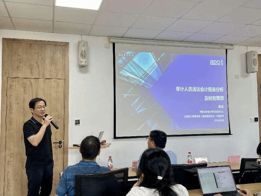 颁奖仪式结束后,立信会计师事务所(特殊普通合伙)宁波分所权益合伙人(业务二部负责人)黄波先生还为大家做了《审计人员浅谈会计报表分析及财务舞弊》的主题讲座,黄波先生工作经验丰富,语言幽默风趣,他结合自己多年的审计工作实践,以通信业务案例为入口,对审计理论和审计实务做了非常精彩的一趟现场教学,与会的师生都受益匪浅。