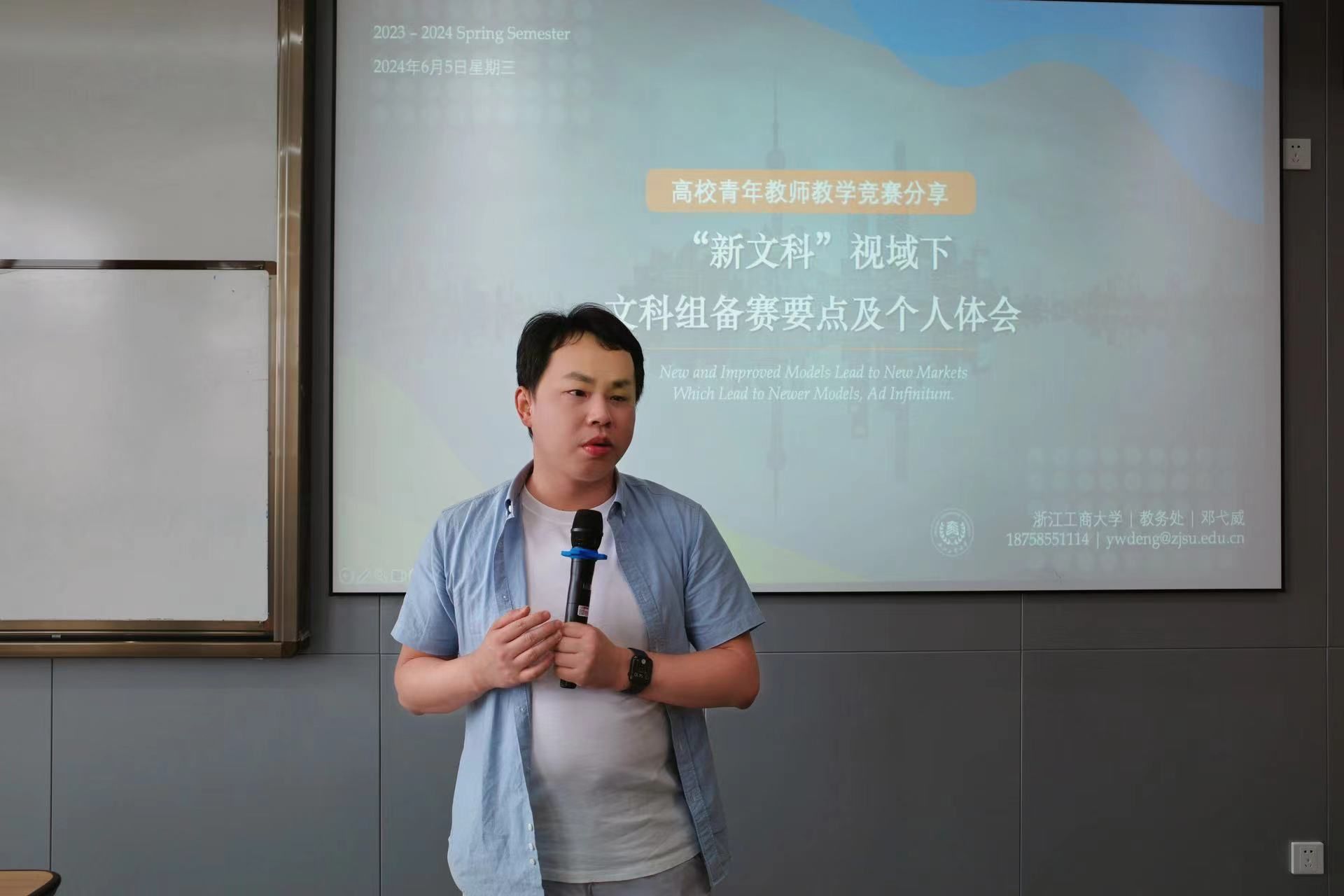 邓弋威教授作为全国高校青年教师教学竞赛文科组一等奖获得者,结合青教赛和教师教学创新大赛的实战经验,分享其丰富的教学经验与独到的教育理念。活动通过主题报告、教学展示以及现场交流讨论的形式进行,为青年教师们提供了一个学习、交流和提升的平台。
