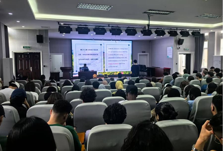 讲座伊始,毛跃祖介绍了余警官并汇报了此次讲座的主要流程和内容。随后,余达警官结合工作实际介绍了校园和公共安全事件的种类、特性和危害,涉及签证、非法就业、交通安全、节假日注意事项、禁毒、防诈、禁止“三非”等安全相关事件。余警官用生动丰富的案例教育警示留学生要遵守中国法律法规和校纪校规,并特别提醒留学生不要醉酒和酗酒,及时办理延长签证,避免陷入不必要的麻烦。余警官的案例分享结合工作中的亲身案例,对留学生具有很强的启发性,起到了较好的警示教育作用。会后,在提问与回答环节,余警官和留学生就交通安全、非法就业、校外住宿等关注的事项进行了交流。此外,余警官强调了相关规定与法律学习的重要性,呼吁国际学生认真学习校纪校规与法律法规,做一个知底线明纪律、知法守法的国际学生,护航留学安全,助力学业无忧。