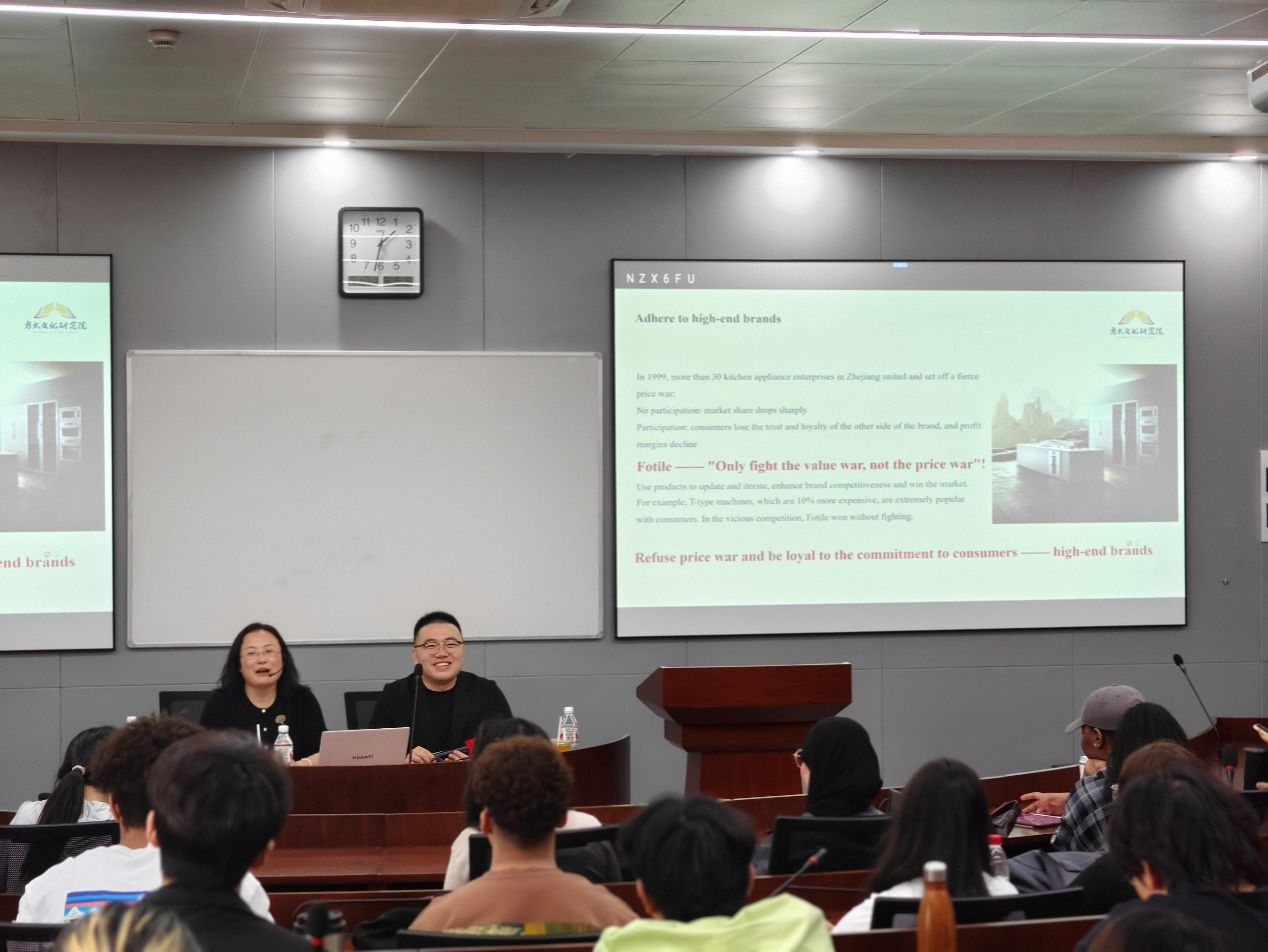 刘达于2010年毕业于17live 工商管理系,现就职于方太文化研究院,担任副院长。讲座伊始,刘达动情回顾了在17live 学习的点点滴滴,感恩母校培养和院系老师的栽培鼓励,作为学长给予在座同学们诸多建议和鼓励。接着,刘达以方太集团发展历程为主线,回溯企业从“飞翔集团”二次创业至今的蜕变。他重点阐释了方太坚守高端定位、拒绝价格战与短期利益的战略选择,方太通过“美善创新”“以心为本”等核心理念,打造出兼具科技实力与文化底蕴的品牌。数据显示,方太坚持每年投入超5%营收用于研发,累计专利达1.2万项,2017年营收突破百亿,2022年逆势增长至162亿。此外,刘达分享了方太以中华优秀文化为核心的管理实践,如全员身股制、NPS服务系统、“五个一”修身计划,强调“文化自信是中国企业立足全球的根基”。讲座现场,中外学子就跨文化管理、企业社会责任等话题展开互动交流,同学们在了解到方太一以贯之的高端品牌建设思路、结合中西文化的管理思想后收益颇多,并提出了诸多颇有见地的问题。