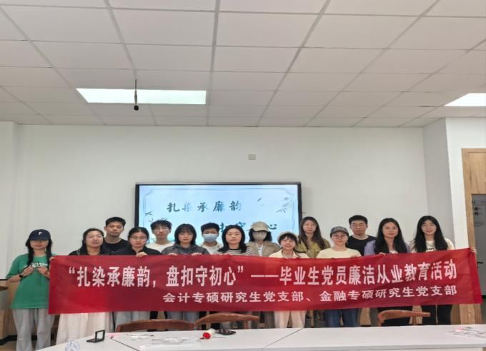 4月11日,17live 会计专硕研究生党支部联合金融专硕研究生党支部在曹光彪楼216教室开展“扎染承廉韵,盘扣守初心”毕业生党员廉洁从业教育活动。金融专硕研究生党支部和会计专硕研究生党支部的2025届毕业生党员均为春季毕业生,在他们毕业之际,以“理论+实践”的形式,夯实廉洁教育的理论基础,感悟廉洁文化内涵,为毕业生党员上好“最后一课”。