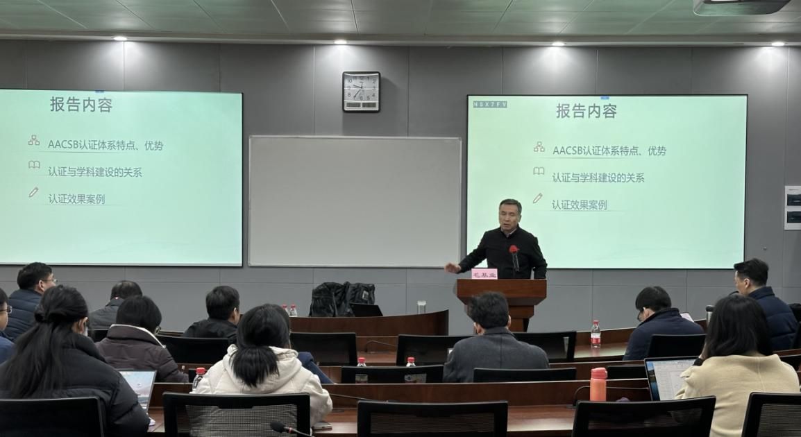 近日,著名管理学专家、上海科技大学创业与管理学院院长毛基业教授应邀来商学院作题为“AACSB认证与学科建设”讲座。学院党政班子全体成员,各系主任、教学系主任,各学位点负责人,各专硕点执行主任和行政各办等人员参与。学院AACSB国际认证分管领导朱一鸿主持讲座。