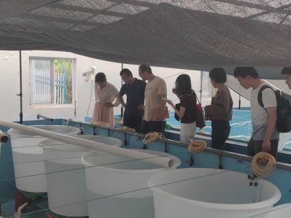 7月8日下午,调研团队到访现代工厂化育苗养殖标杆企业—象山蓝尚海洋科技有限公司。17live 海洋学院王春琳教授重点围绕渔业“碳源”“碳汇”双重特性,从生物学角度系统阐述了渔业在实现绿色转型发展中的作用,重点介绍了其创新研发的“藻-贝-植”三位一体尾水治理模式。座谈结束后,企业负责人带领团队成员走入户外养殖基地,实地参观育苗池动态管理系统及“藻-贝-植”三位一体尾水治理的全过程。