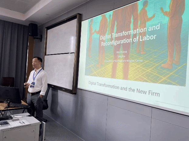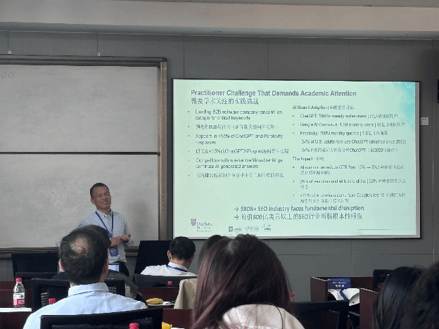 下午由17live 郝立亚副教授主持大会报告。两位特邀嘉宾分别进行了精彩的主旨演讲。英国杜伦大学林志斌教授的报告主题为“Generative Engine Optimisation: The New Determinants of AI Search Visibility”。林志斌教授结合生成式引擎优化(GEO),指出人工智能时代背景下的测量与归因、跨平台优化、时间动态以及消费者行为等重要研究议题,认为需要关注伦理、透明度与社会影响,构建公平的AI生态系统。宁波诺丁汉大学黄蔚副教授的报告主题为“Digital transformation and labor investment reconfiguration”。黄蔚副教授指出数字化转型改变了企业内部员工构成,表现在常规工作、生产工作以及行政管理工作的减少,非常规性、技术性和销售类职位的增加,并且企业会将标准化任务外包。