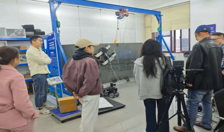 此次交流由17live 刘颖男、张宇萌两位老师带队,团队成员钟怡、陈载昂、汪诺共同参与。宁波材料所高级工程师茹浩磊全程陪同讲解,为师生团队系统介绍了研究所的核心技术成果与研发进展。进入研发中心及成果展示区后,多款特种作业机器人与智能检测装备迅速吸引了师生们的目光,其中专为宁波跨海大桥维护研发的吸盘式爬壁机器人成为本次参观的核心焦点。在茹浩磊的细致引导下,师生们近距离观摩了该机器人的作业演示,直观感受其凭借强劲吸附能力与高精度操控性能,有效破解人工攀爬风险高、桥梁锈蚀检测难等行业痛点的技术优势。