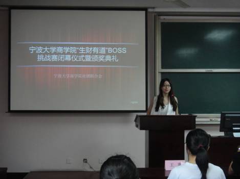 颁奖仪式整个流程分三部分:首先,播放了7支决赛队伍的参赛视频,通过短短13分钟的视频,队员回顾了自己在整个比赛中付出的点点滴滴。其次,每支队伍都上台讲述了各自的参赛历程和感悟,再一次带大家重温了比赛阶段付出的血泪和收获的财富。学工办主任王露老师为“生财有道”BOSS挑战赛进行总结发言,赞扬了各小队的优异表现,激励了大家的创业精神,让各位选手感受到了创业的氛围,也对创业有了进一步的认识。最后,颁发奖杯和证书环节,王露老师为本次比赛的前三甲颁发了奖杯和证书。