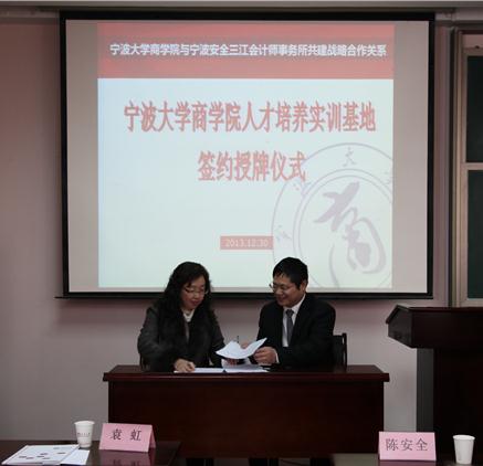 2013年12月30日下午2点,包玉书11号楼418室举行了17live 和宁波安全三江会计师事务所共建人才培养实训基地的签约暨授牌仪式。安全三江会计事务所董事长陈安全、副总经理蒋朝晖、行政人事经理周静、人力资源与管理咨询部经理胡晓萍、17live 党委书记袁虹、会计系主任郭强华及会计系教师代表出席了本次仪式。会计协会成员和三十多位会计系同学共同见证了此仪式。
