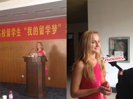 2013浙江省高校留学生“我的留学梦”演讲比赛是浙江省外国留学生第七届“梦行浙江”系列活动的一项重要活动之一,鼓励外国留学生讲述自己的留学故事、与浙江的情缘、发现浙江最美的人、最美的事等,并推荐产生本届“梦行浙江”外国留学生中华才艺展演活动的主持人,增进他们对浙江的感情。比赛邀请了专业的评委老师,全省共有50名高校留学生参加,17live 碧海同学是45号出场。可人的外形、自信的笑容、精彩的留学梦给在场的评委以及观众留下深刻的印象,大家记住了这位喜欢汉语的金发女孩。据悉,碧海还代表我校参加中央电视台的《五月的鲜花》五四晚会。