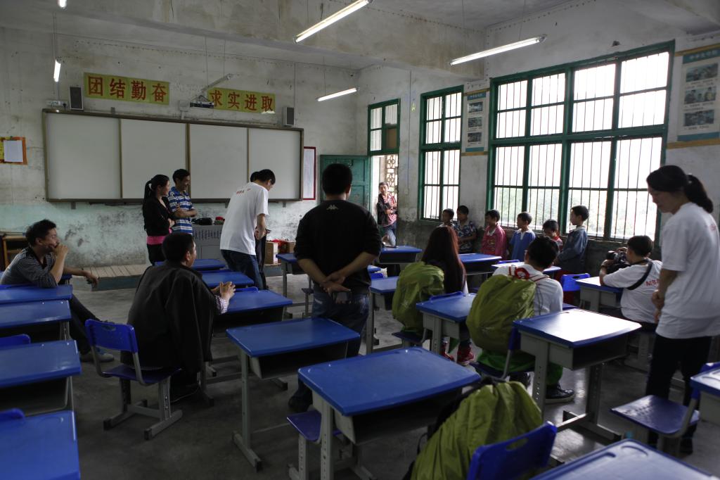经过了山路十八湾,也不知翻过了几座山,二个小时后到达了谢家坪小学,学校向校长和几位主要老师都在校门口等着我们的到来。由于前期经过多次电话沟通,尽管是第一次见面,大家也没有多大的陌生感,正如老友相聚,分外亲切。向校长热情地带我们参观了目前的校区建设,“谢家坪是由三个自然村组成的,谢家坪小学是五峰较偏远的一所乡村小学;现有6个教学班,在校学生127人,另有1个学前班,学生27人,共计154人;学校目前共有教师18人,学历师资以高中为主。”向校长带着浓浓地方特色的普通话,笑起来带着却似孩童般腼腆, “学校操场、食堂都是援建而成的,因当地财政拨款有限,目前的教学楼都是1995建造的中学教学楼搬走后给小学生们使用的,而之前的小学教学楼就给老师们当了宿舍,但也是一级危房了。”